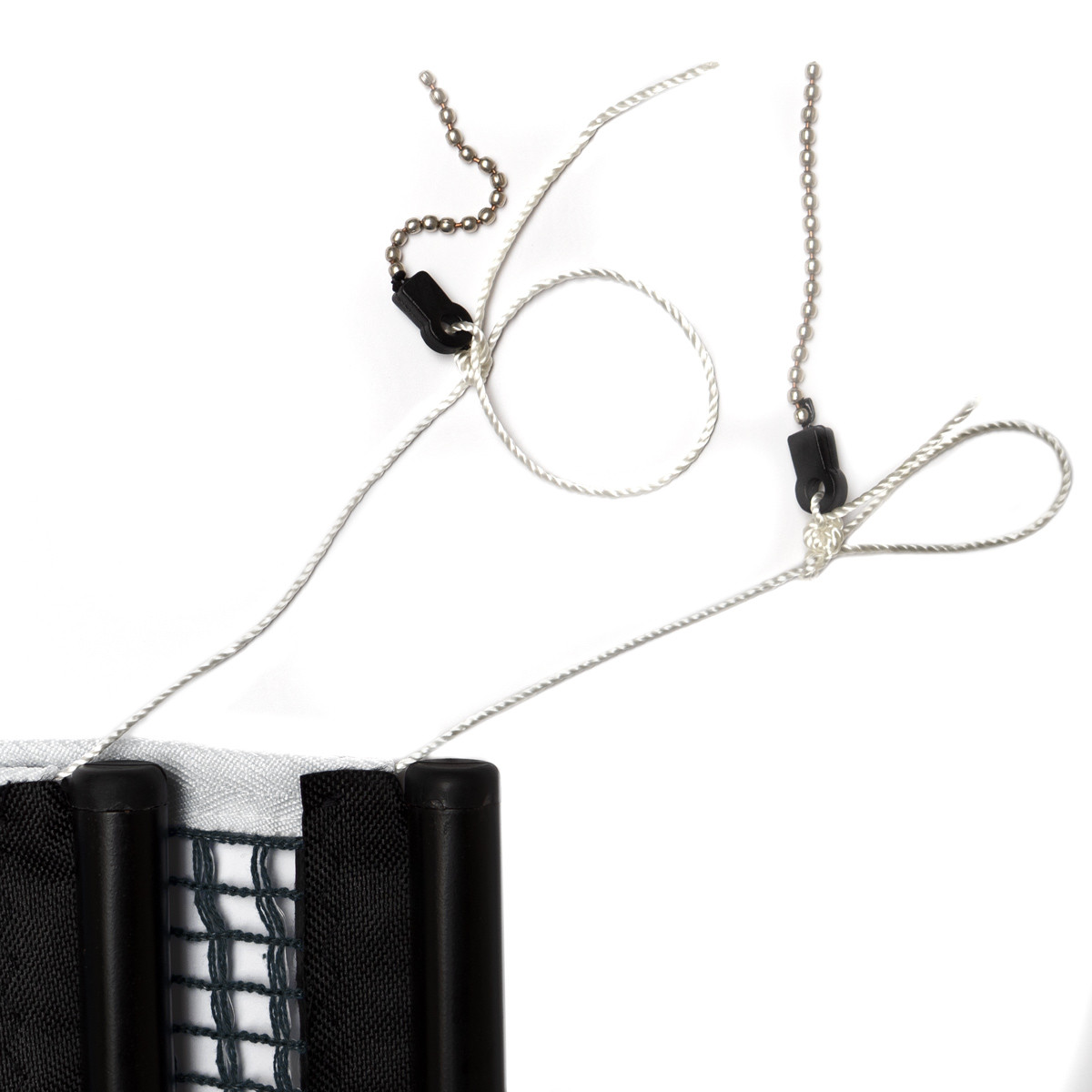 Ein in einen schwarzen Netzpfosten integriertes Ersatznetz mit den Netzmaschenfarben: schwarz, blau und grün.