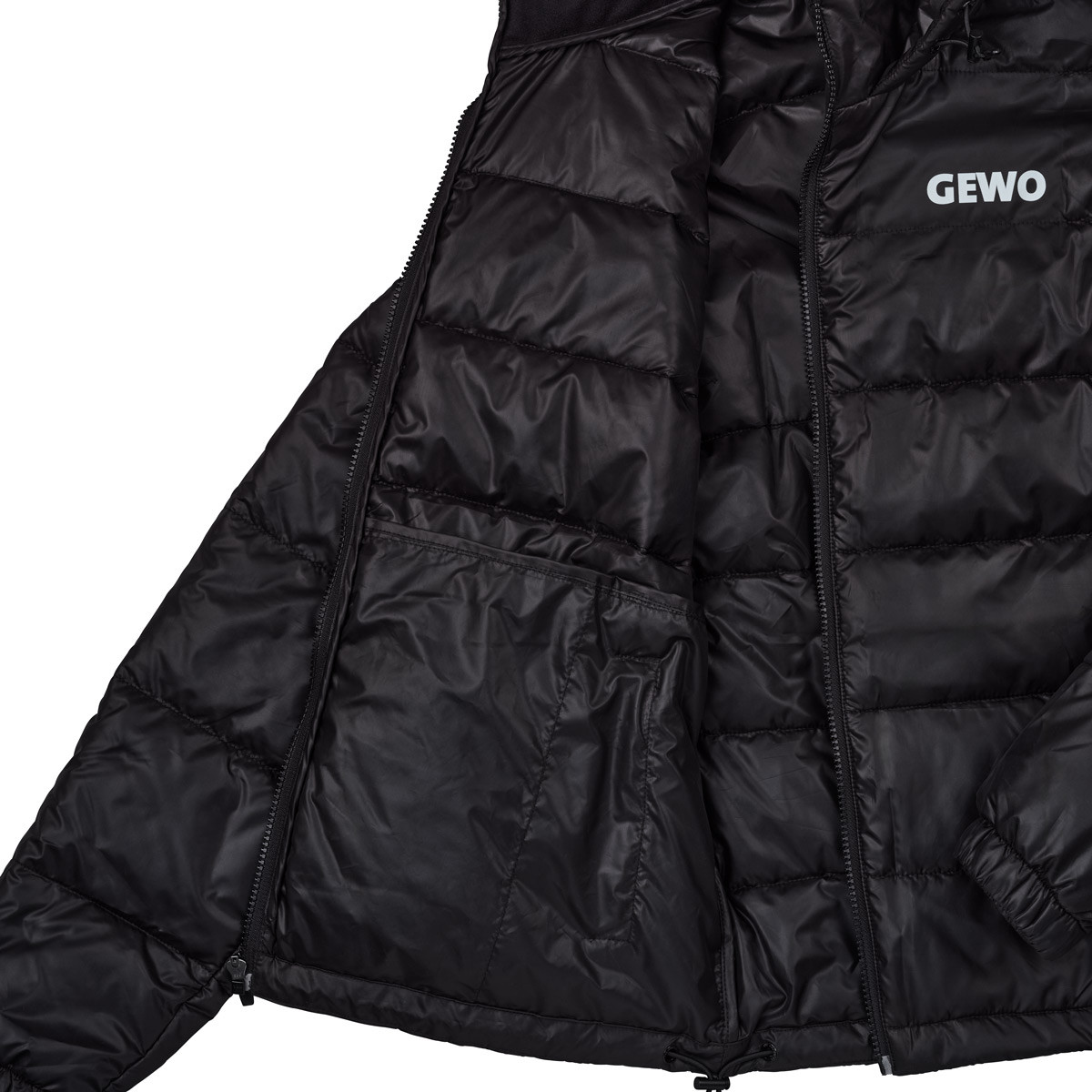 Die schlichte, klare Optik der Jacke wird durch das weiße GEWO-Logo auf der Brust und das weiße Rubber-Logo am linken Arm aufgelockert. Beide Elemente setzen einen sichtbaren Kontrast zur schwarzen, leicht glänzenden Oberfläche, wodurch die Jacke modern und zugleich dezent wirkt. Der glatte Oberstoff reflektiert Licht sanft.