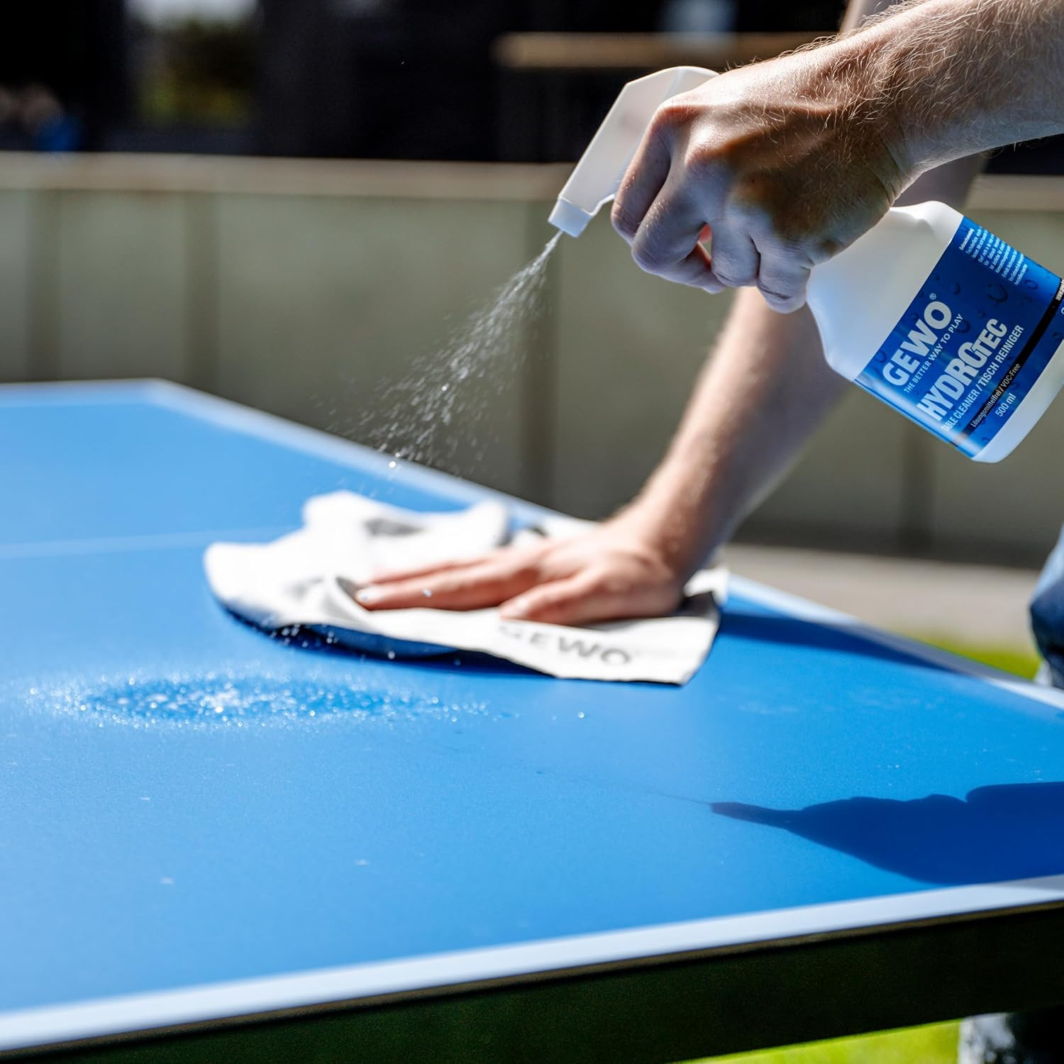 Wie bei vielen anderen Produkten gilt auch für Tischtennistische: Je regelmäßiger die Reinigung und Pflege, desto länger die Lebensdauer. Aus diesem Grund hat GEWO einen speziellen Tischreiniger entwickelt, der optimal auf die Erhaltung und Pflege Deines Tisches abgestimmt ist. Das von uns angebotene Set besteht aus einem Flüssigreiniger und einem Mikrofasertuch und enthält alles, was Du für die Pflege Deines Tisches benötigst. Der HydroTec Tischreiniger eignet sich sowohl für Indoor- als auch für Outdoor-Tischtennisplatten.